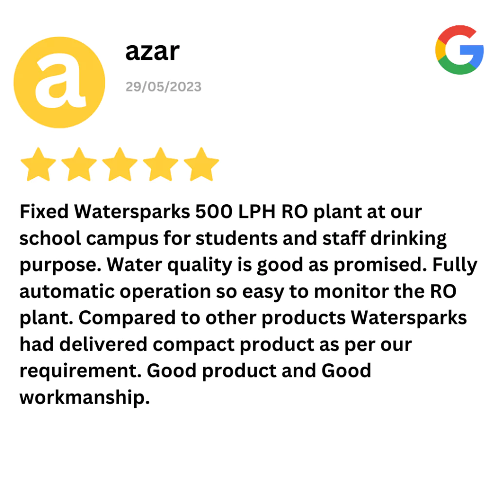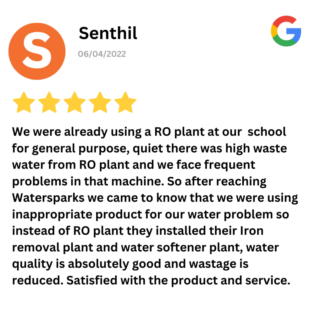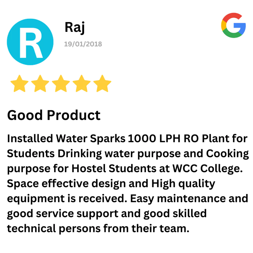 We being into this food Industry for past few years, have tried many solutions in terms RO water. Being with different RO water companies we have always had a kind of dissatisfaction, and lacked service. Fortunately after Meeting Manohar from WaterSparks, his expertise and the experience in this field of RO has given me a immense knowledge and trust to give his product a try. We at our mylapore Nithya Amirtham Veg Restaurant are using 1000LPH, has helped us in saving power , and we were able to give a best water to customer for drinking purpose and best to chef for cooking purpose. Strongly Recommend.